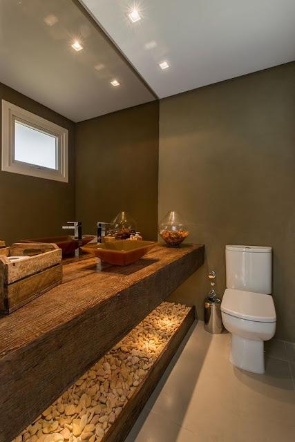 Ouse nos tons das cores, contrastes com texturas, acabamentos mais nobres, atenção especial para iluminação, louças de boa qualidade, acessórios necessários para não atrapalharem o visual e a bancada, espelhos trazem amplitude, beleza e refinamento ao lavabo.